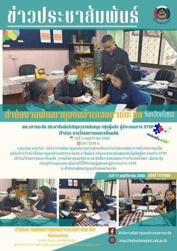 พร้อมด้วยเจ้าหน้าที่พัฒนาชุมชนอำเภอมหาชนะชัยประชาสัมพันธ์ เชิญชวน/และสนับสนุนกลุ่มผู้ผลิตผู้ประกอบการ OTOP เข้าร่วมโครงการคนละครึ่งพลัส ตามนโยบายของรัฐบาล และข้อสั่งการของพัฒนาการจังหวัดยโสธร เพื่อกระตุ้นเศรษฐกิจในชุมชนและเพิ่มรายได้ให้กับกลุ่มผู้ผลิตและผู้ประกอบการ OTOP