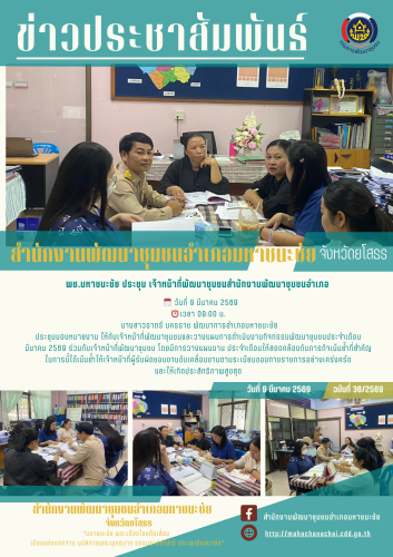 ประชุมวางมอบหมายงาน ให้กับเจ้าหน้าที่พัฒนาชุมชนและวางแผนการดำเนินงานกิจกรรมพัฒนาชุมชนประจำเดือนมีนาคม 2569 ร่วมกับเจ้าหน้าที่พัฒนาชุมชน โดยมีการวางแผนงาน ประจำเดือนให้สอดคล้องกับภารกิจเน้นย้ำที่สำคัญ