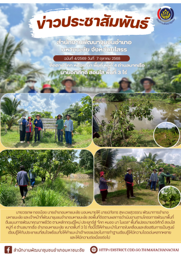 นายวรเทพ ทองน้อย นายอำเภอมหาชนะชัย มอบหมายให้ นายปภังกร สุขะเวชสุวรรณ พัฒนาการอำเภอมหาชนะชัย พร้อมด้วยเจ้าหน้าที่พัฒนาชุมชนอำเภอ ลงพื้นที่ติดตามผลการดำเนินงานตามโครงการพัฒนาพื้นที่ต้นแบบการพัฒนาคุณภาพชีวิต ตามหลักทฤษฎีใหม่ ประยุกต์สู่ "โคก หนอง นา โมเดล" พื้นที่แปลงนายอภิศักดิ์ สอนโส พื้นที่ 3 ไร่ หมู่ที่ 4 ตำบลบากเรือ อำเภอมหาชนะชัย ทั้งนี้ได้ให้คำแนะนำในการขับเคลื่อนและส่งเสริมการเป็นศูนย์เรียนรู้ให้กับประชาชนที่สนใจพร้อมทั้งให้คำแนะนำเจ้าของแปลงในการทำฐานเรียนรู้ ให้มีความโดดเด่น และให้มีความต่อเนื่องต่อไป