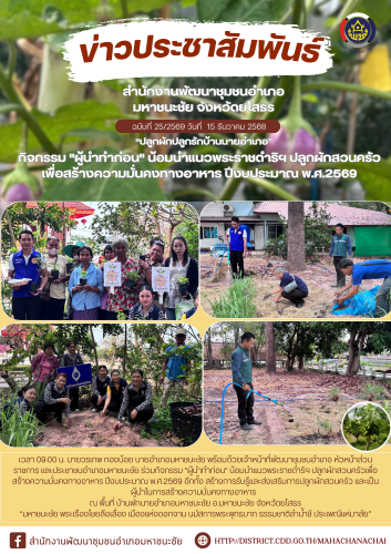 ⏰เวลา 09:00 น. นายวรเทพ ทองน้อย นายอำเภอมหาชนะชัย พร้อมด้วยเจ้าหน้าที่พัฒนาชุมชนอำเภอ หัวหน้าส่วนราชการ และประชาชนอำเภอมหาชนะชัย ร่วมกิจกรรม "ผู้นำทำก่อน" น้อมนำแนวพระราชดำริฯ ปลูกผักสวนครัวเพื่อสร้างความมั่นคงทางอาหาร ปีงบประมาณ พ.ศ.2569 อีกทั้ง สร้างการรับรู้และส่งเสริมการปลูกผักสวนครัว และเป็นผู้นำในการสร้างความมั่นคงทางอาหาร